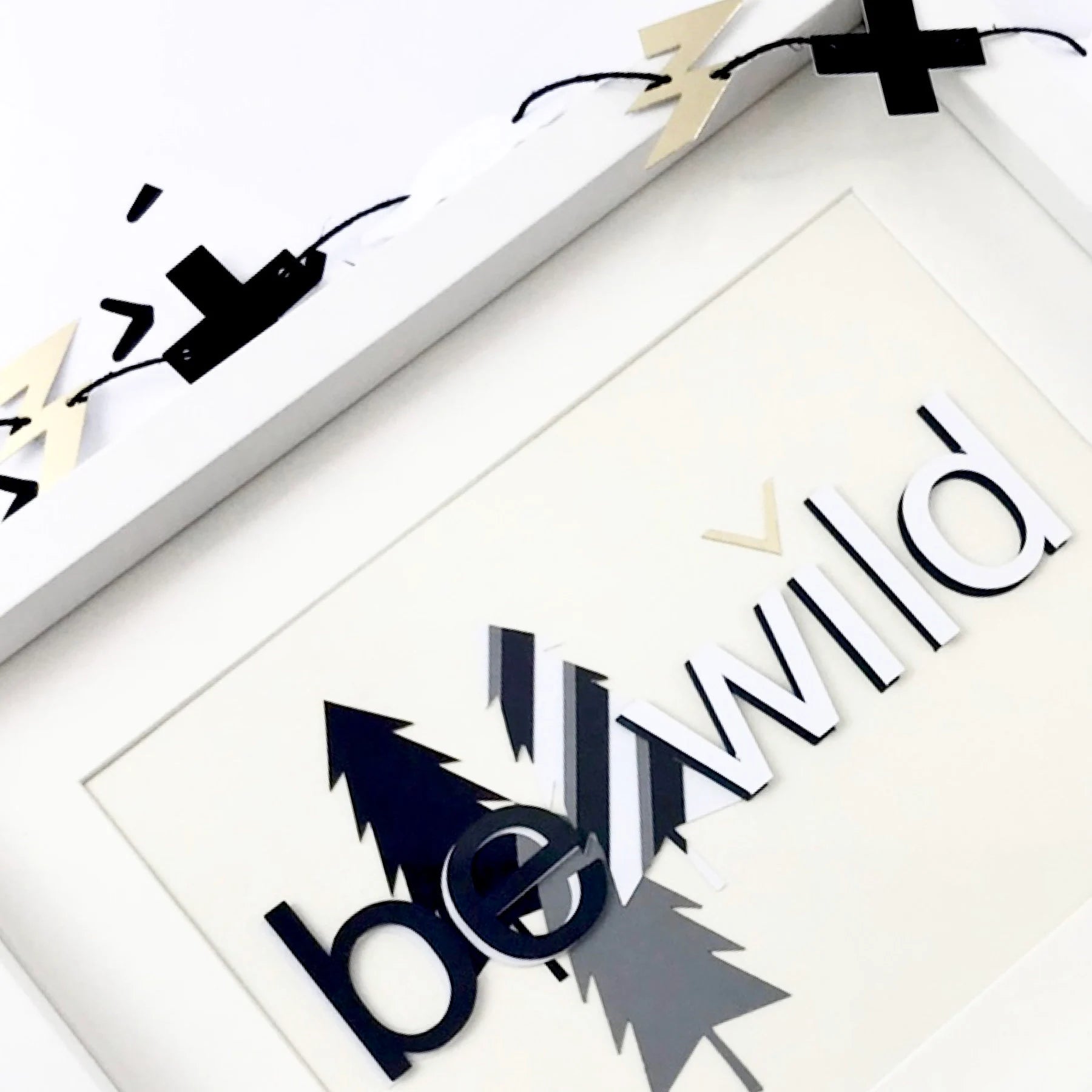 Designed with a black, white and gold colour scheme, this unique piece of typographic forest artwork combines minimalist design with inspiring messaging. At the heart of the composition is the hand-crafted phrase "Be Wild", set against a trio of stylised Norway spruce trees in monochrome tones. The first word features crisp white lettering layered with bold black, while the second reverses this effect, creating a visually striking 3D illusion that adds depth and movement to your wall with artwork.