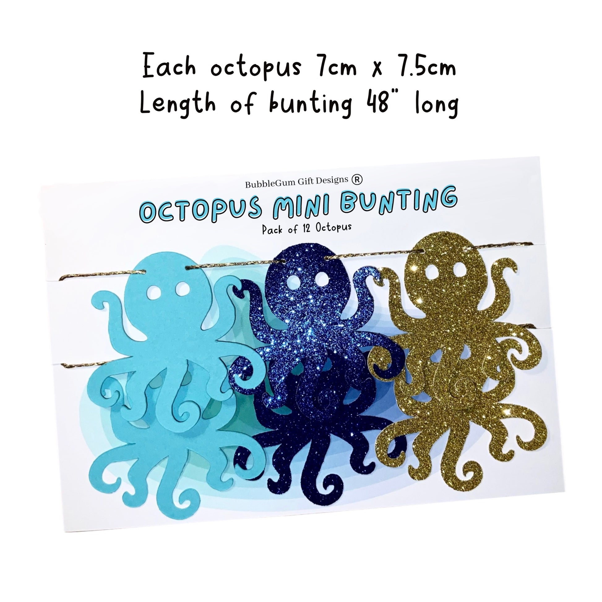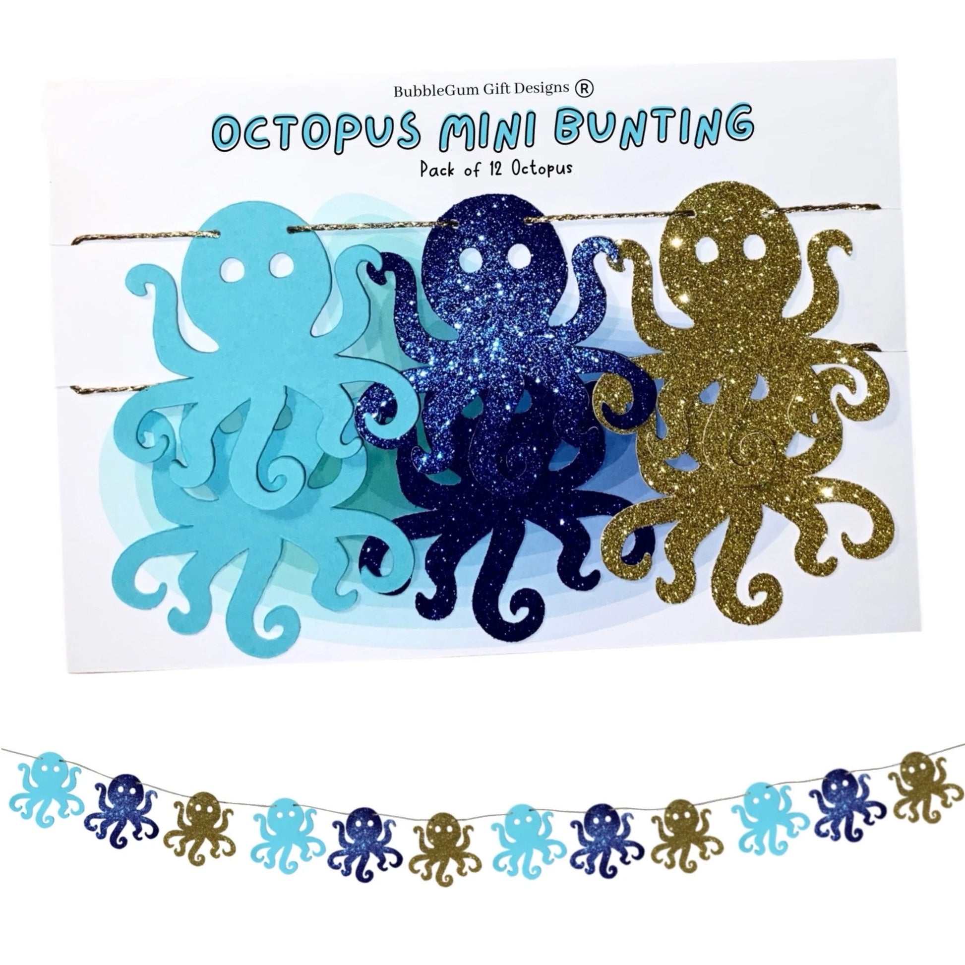 Mini glitter octopus bunting, Nautical baby shower or under the sea birthday decorations, Cute octopus in ocean blues and gold