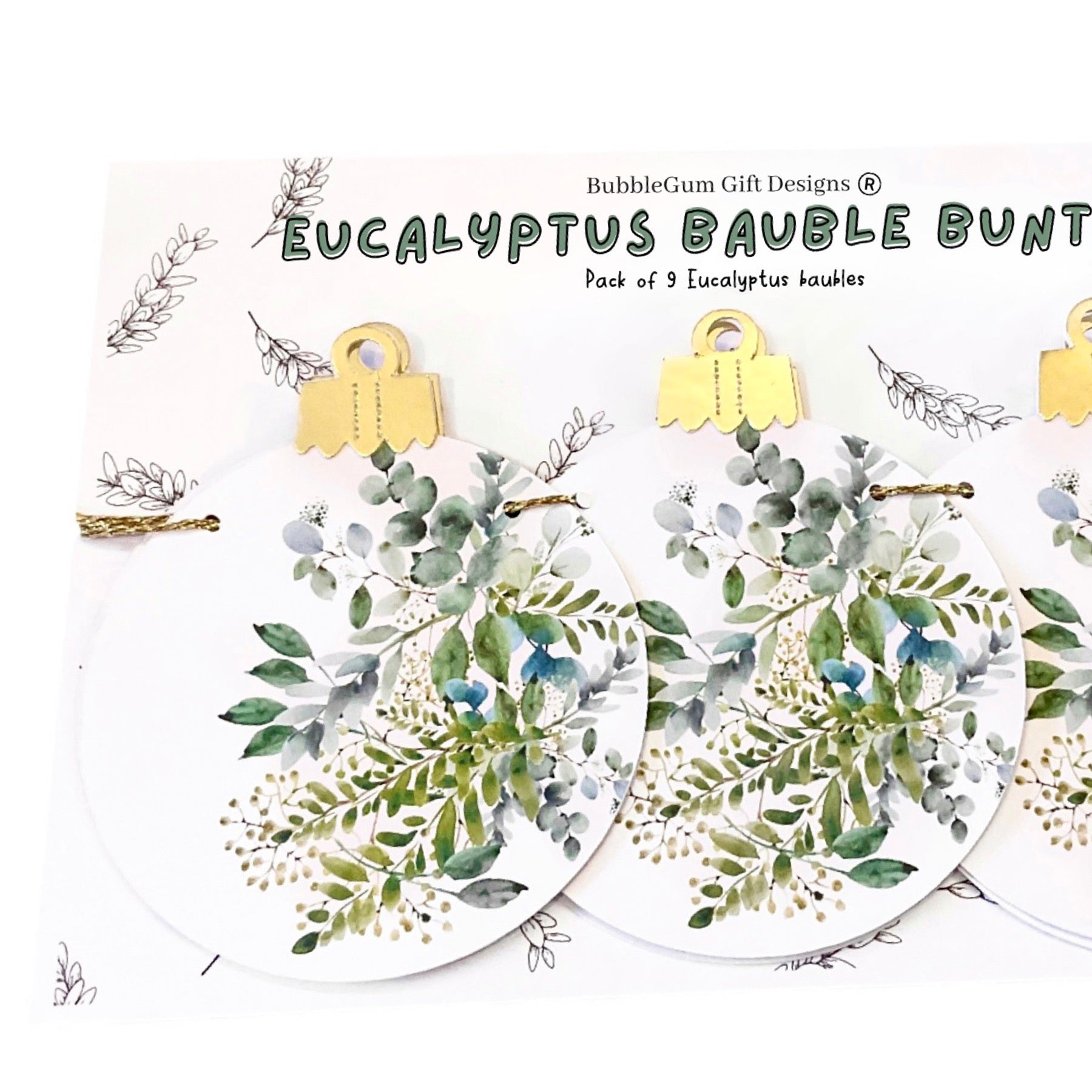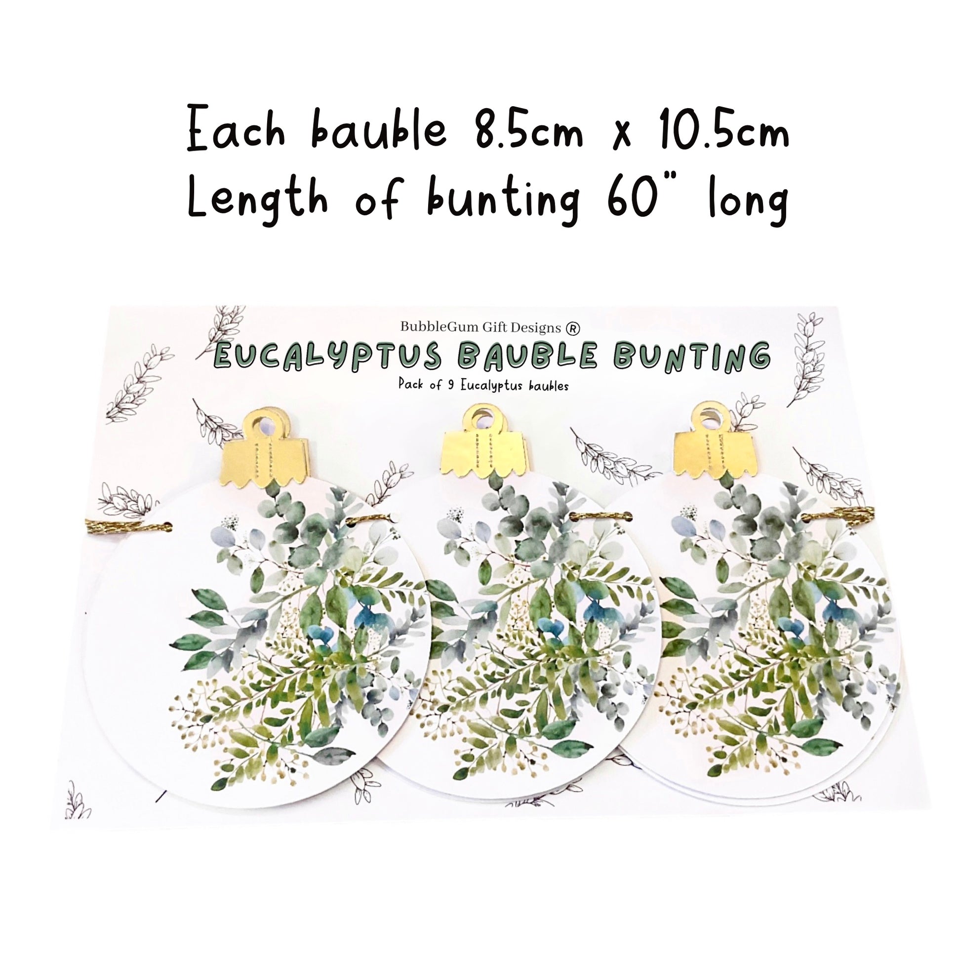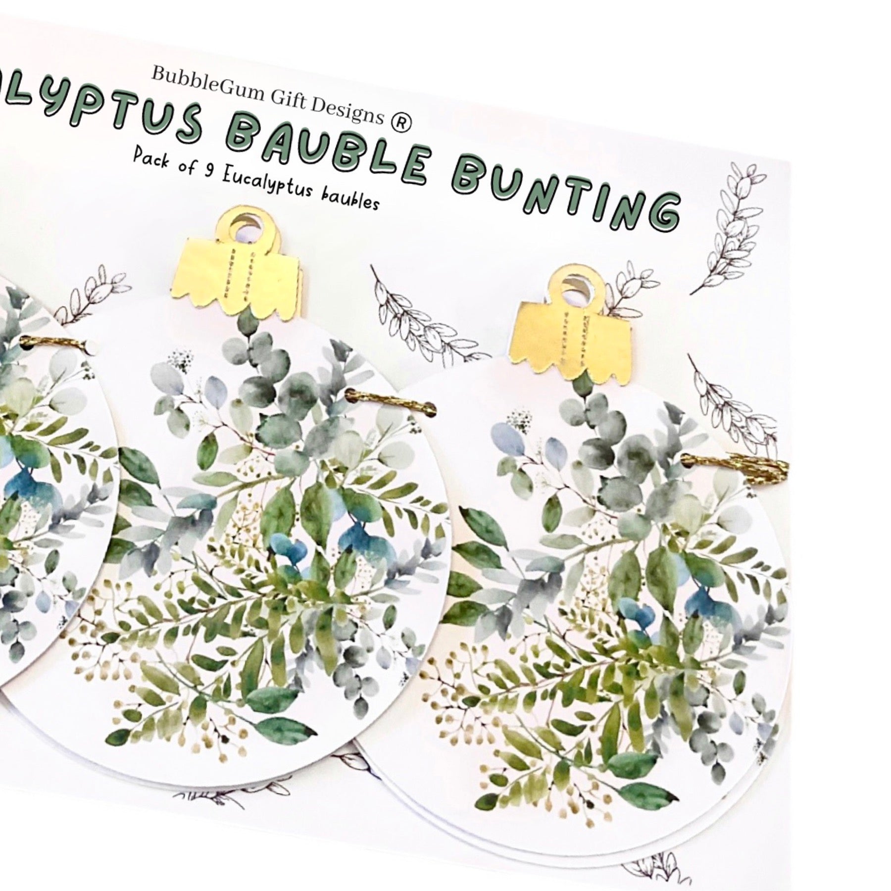 This Christmas, we invite you to get away with being oh-so wonderfully over the top with the silver dollar eucalyptus and various other greenery printed on beautiful premium white 250gsm card stock, this bauble bunting is stunning!