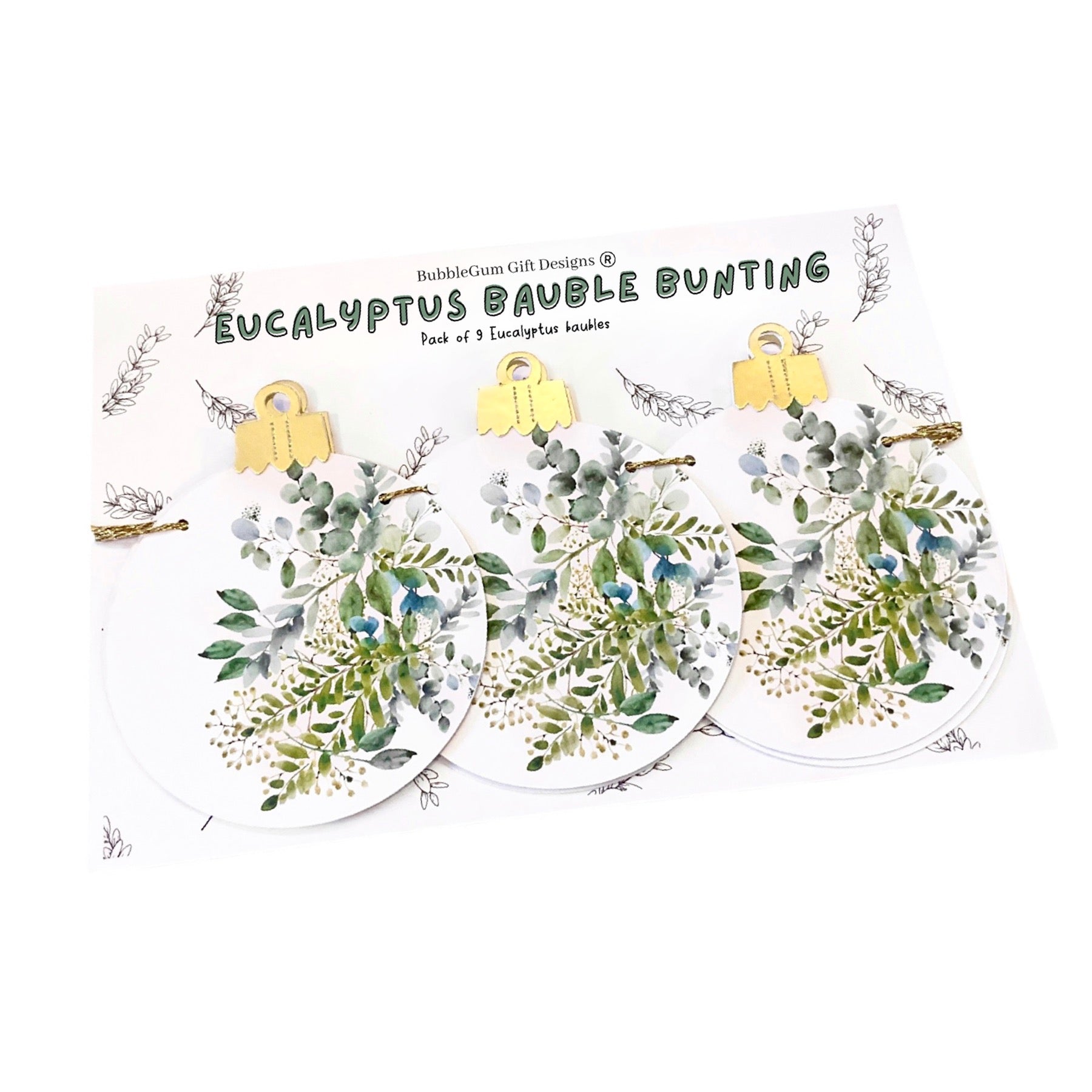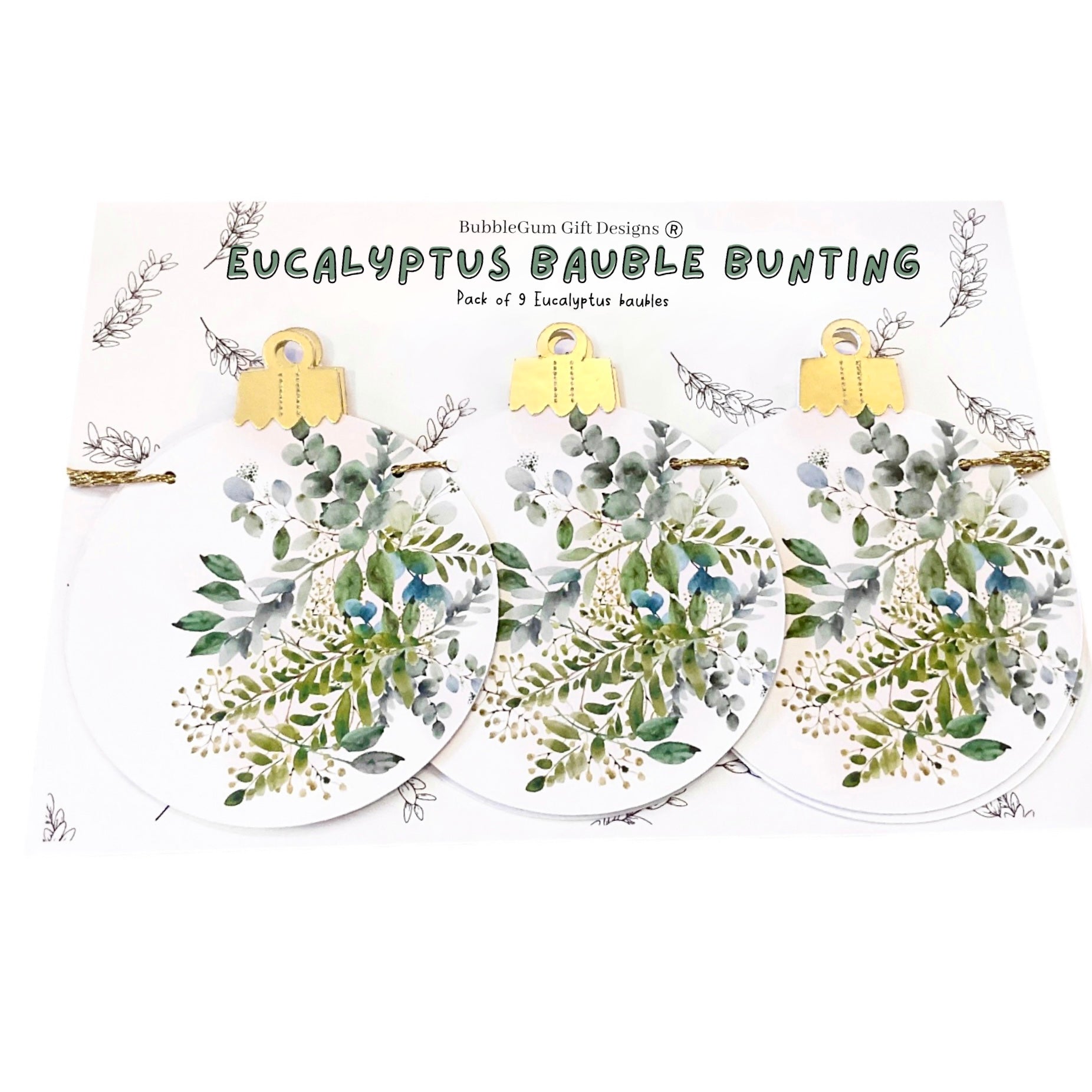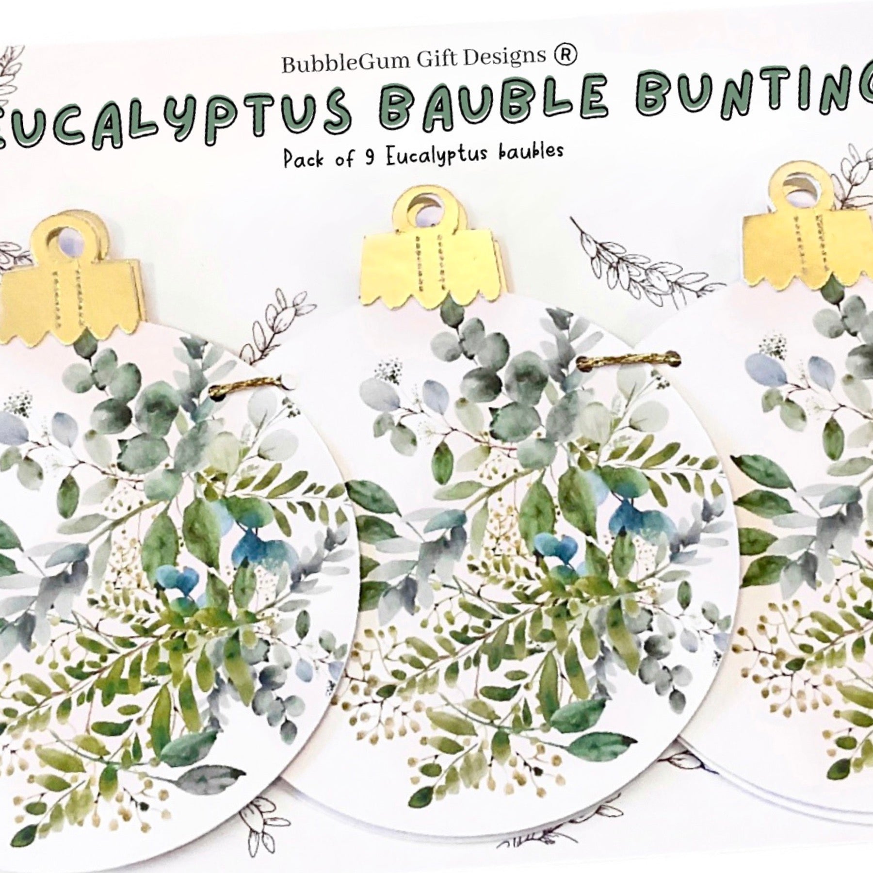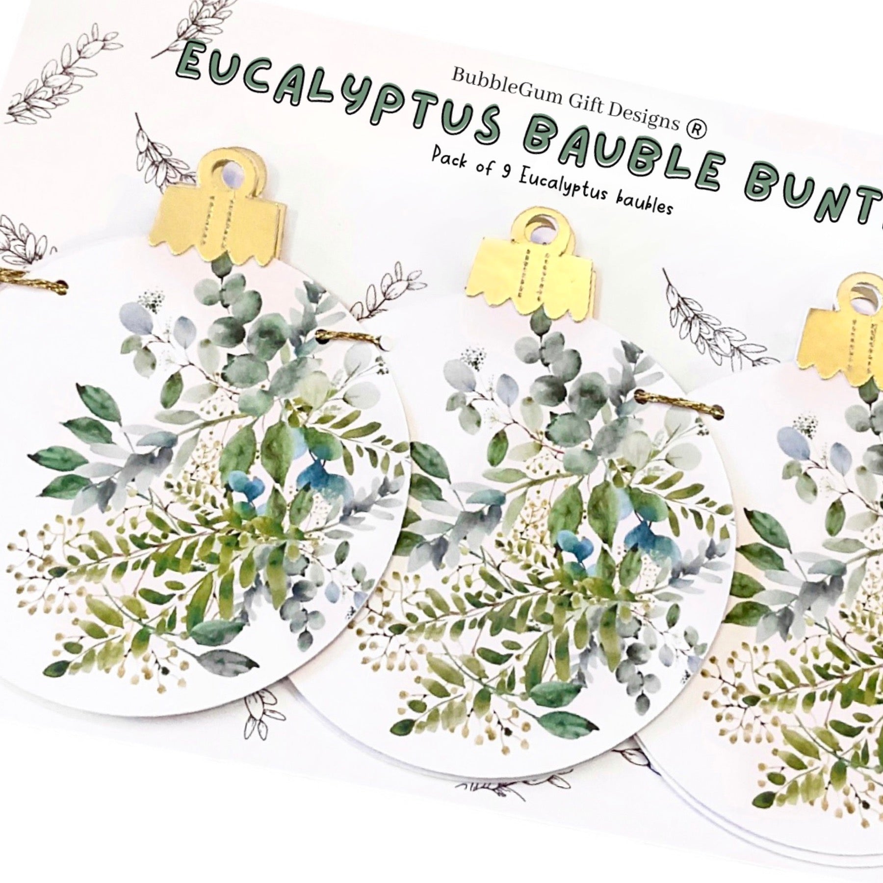This Christmas, we invite you to get away with being oh-so wonderfully over the top with the silver dollar eucalyptus and various other greenery printed on beautiful premium white 250gsm card stock, this bauble bunting is stunning!