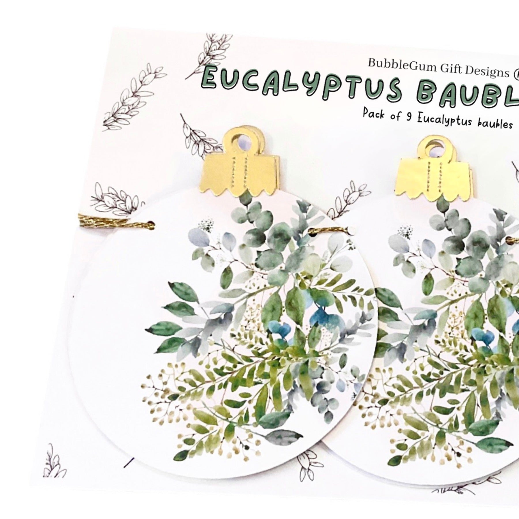A pack of 9 baubles, each one has the Eucalyptus print then a shiny gold bauble hanger top which reflects beautifully when it catches the light, they are so opulent.