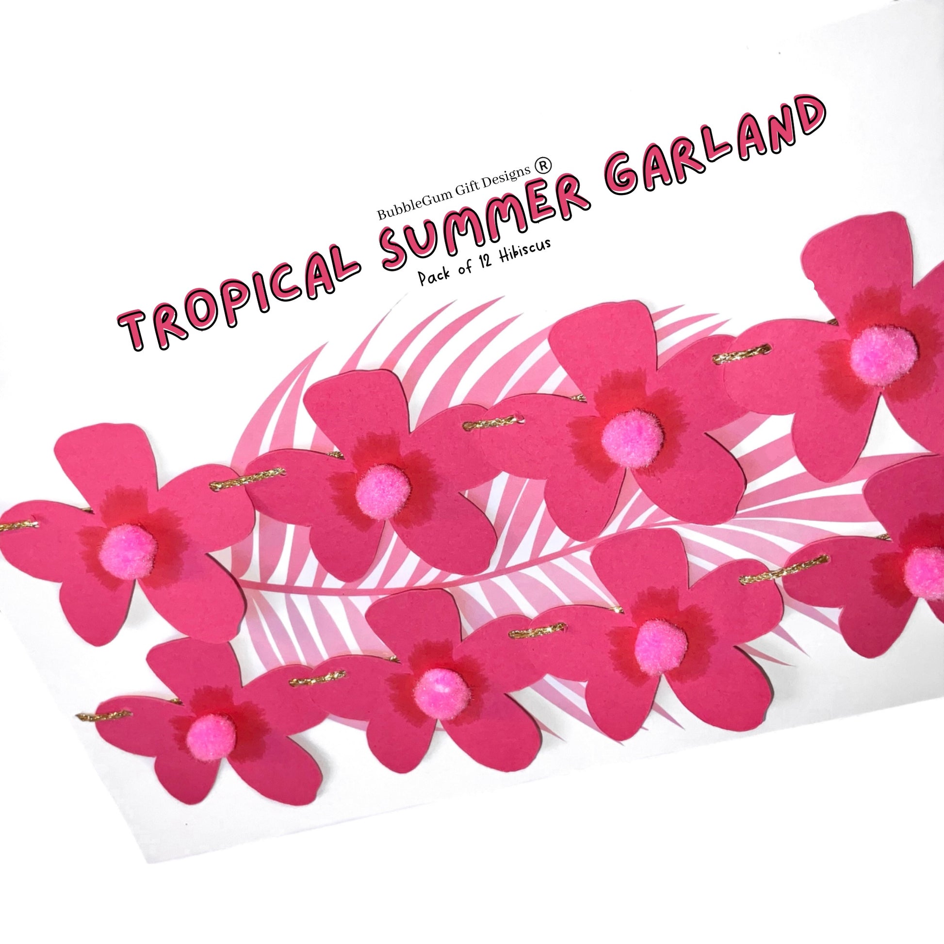 Add a tropical flair to your celebration with this handcrafted mini hibiscus garland, featuring hot pink hibiscus flowers with playful pom pom centres. Perfect for Hawaiian parties, summer birthdays, or baby showers, this vibrant garland is crafted from premium cardstock and strung on sparkly gold twine, creating an eye-catching display.