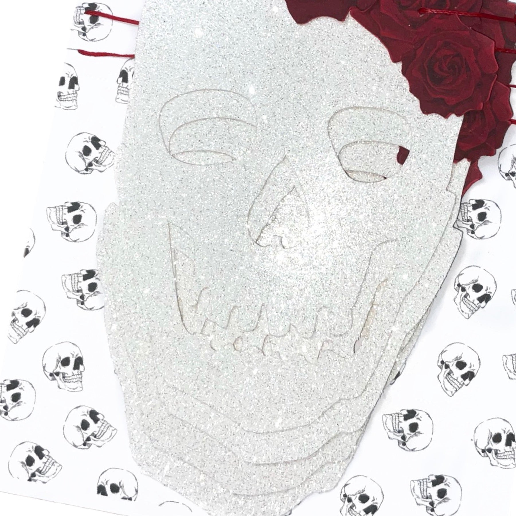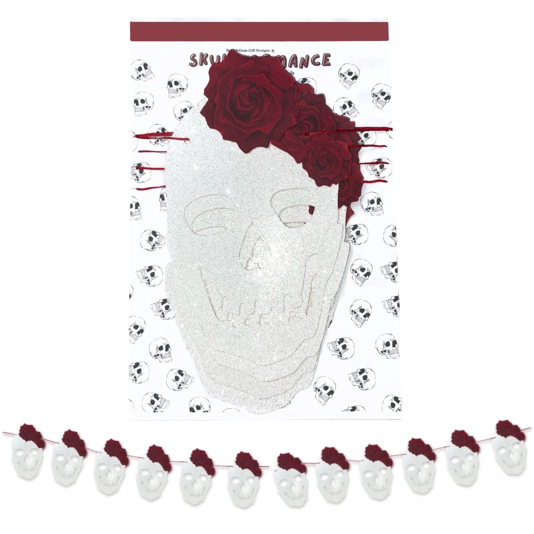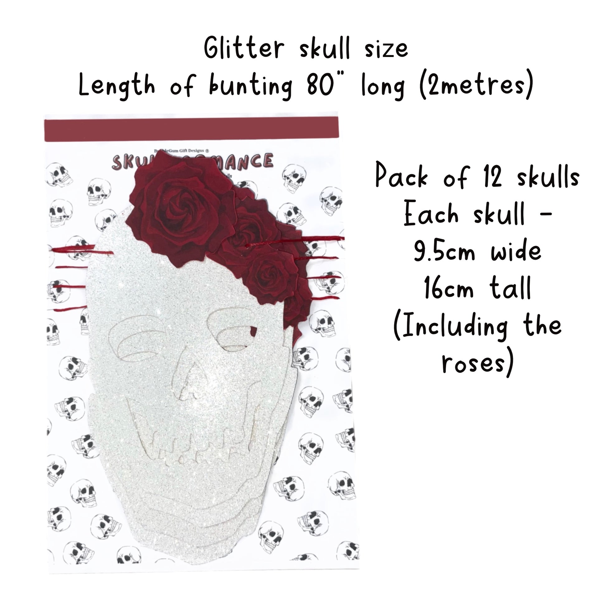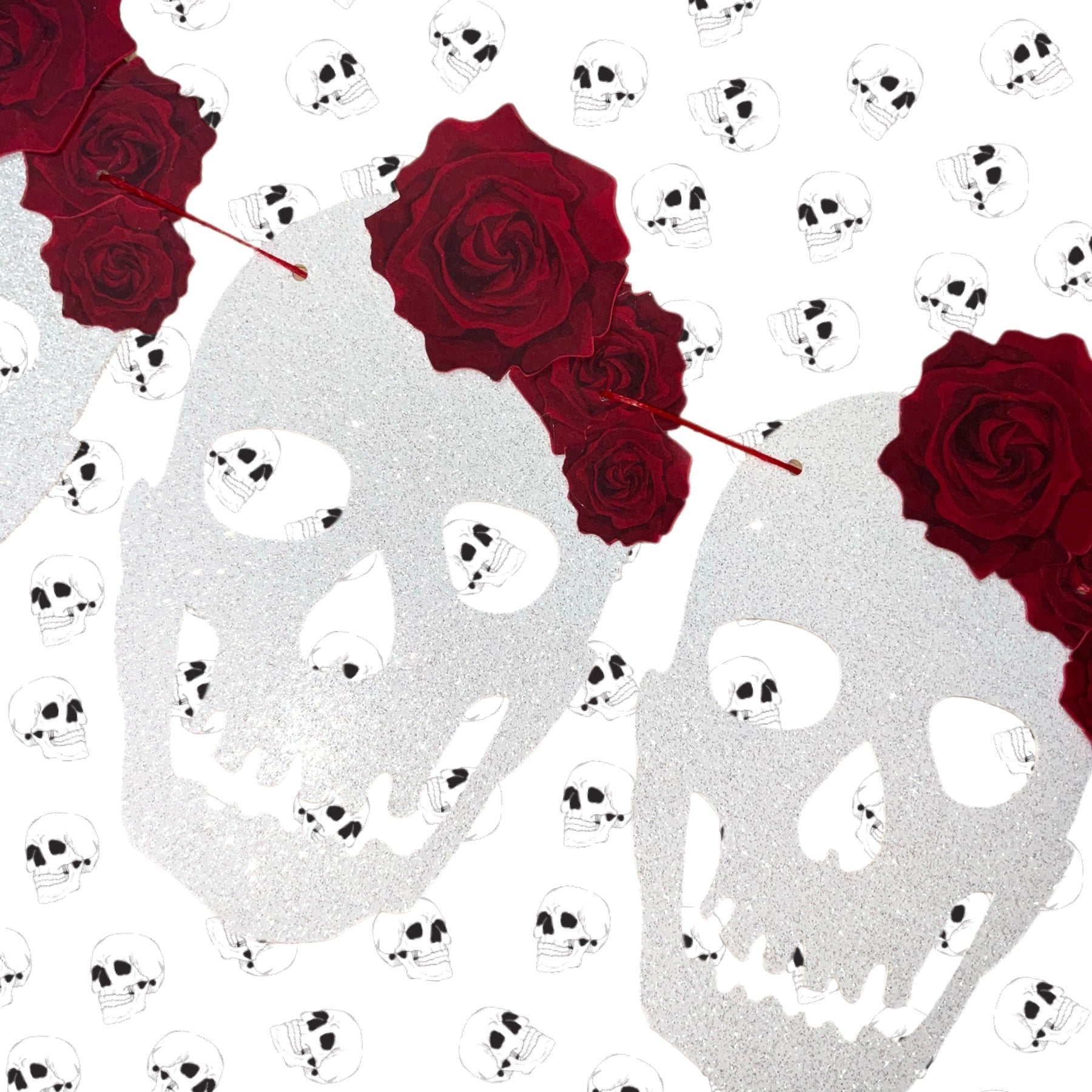 White glitter Skull banner with red roses, Gothic wall decor for spooky season, Skulls Halloween garland