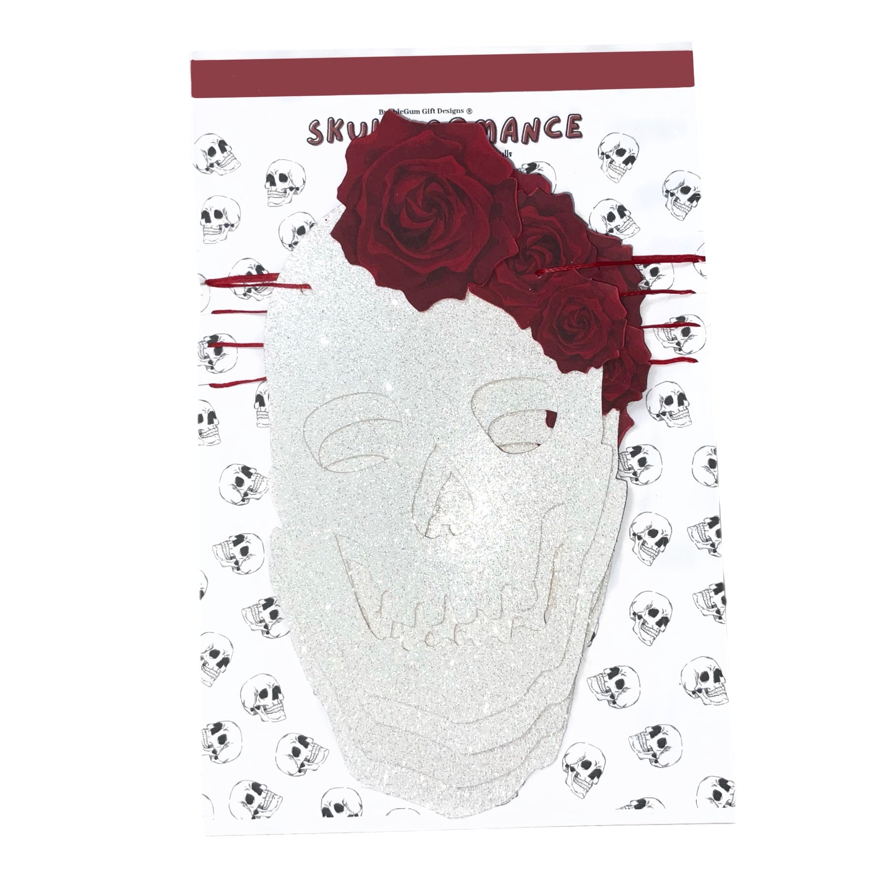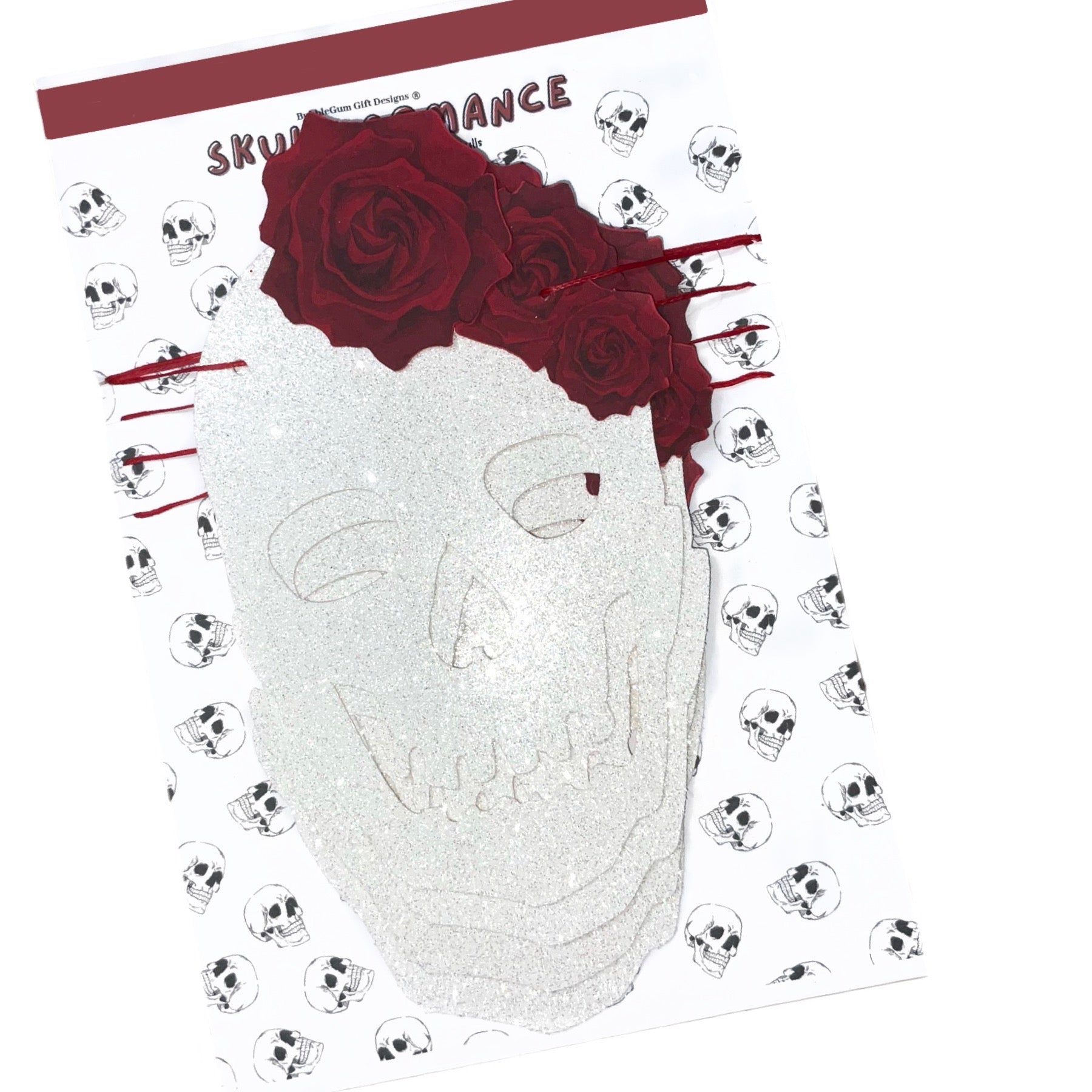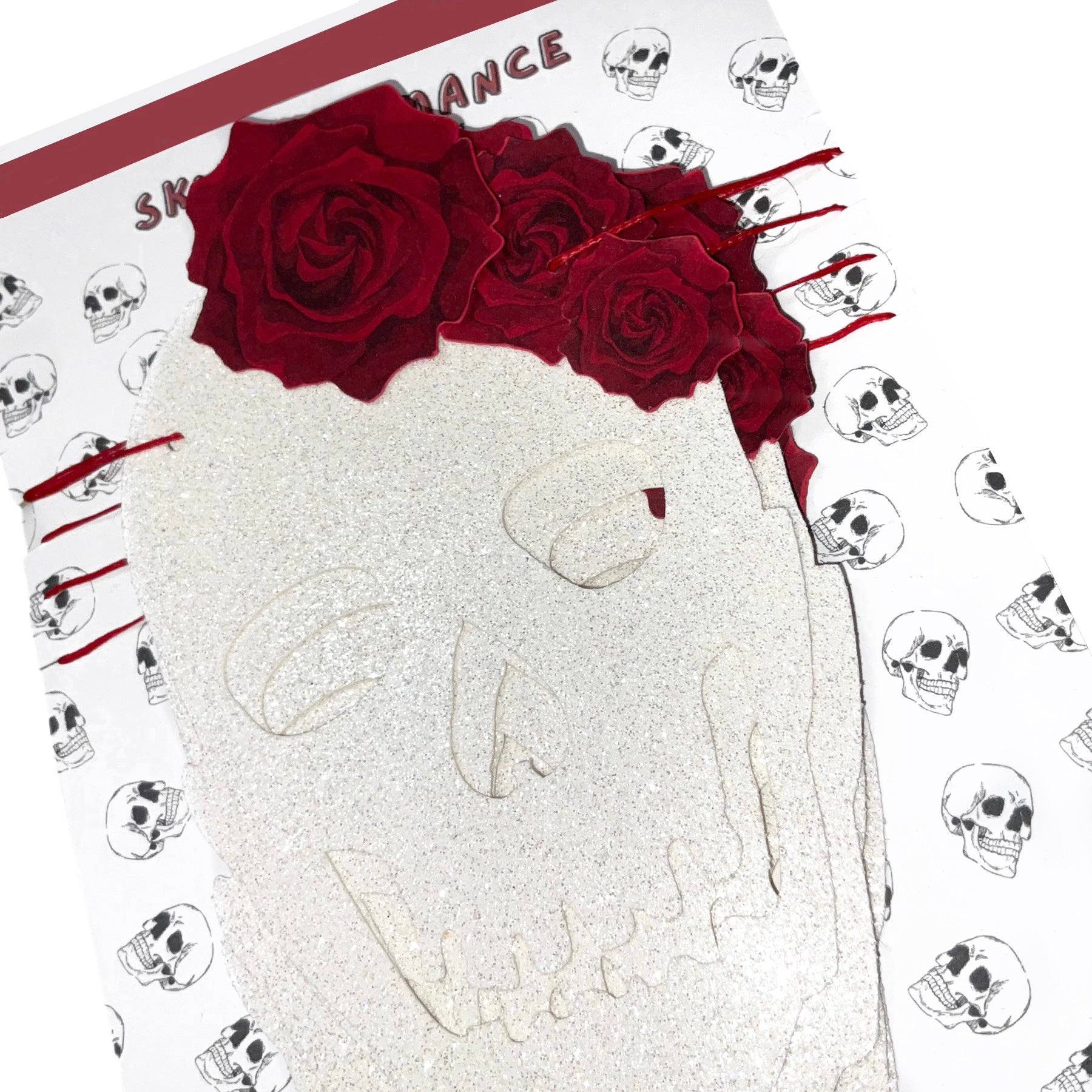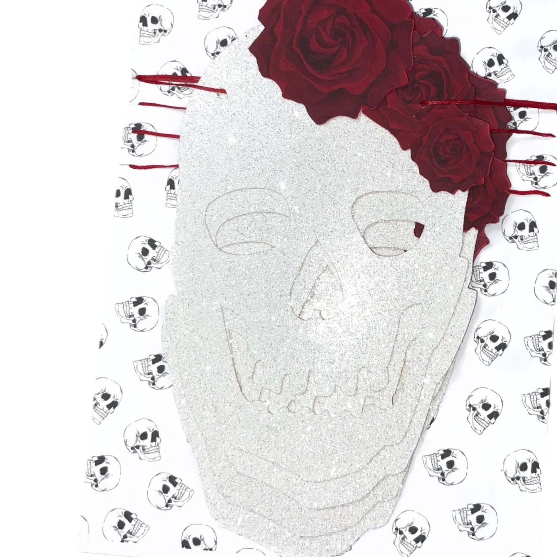 White glitter Skull banner with red roses, Gothic wall decor for spooky season, Skulls Halloween garland