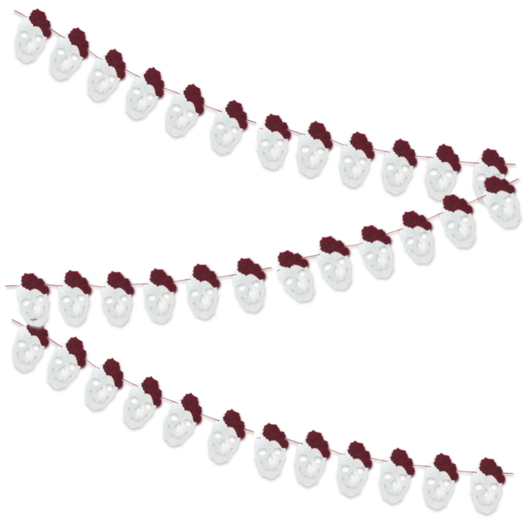 A pack of 12 skulls all attached to red string with the whole garland measuring 80" long (2metres)