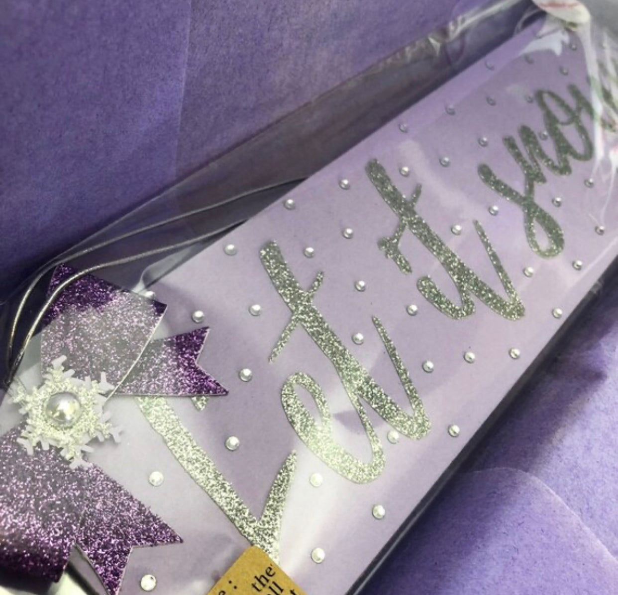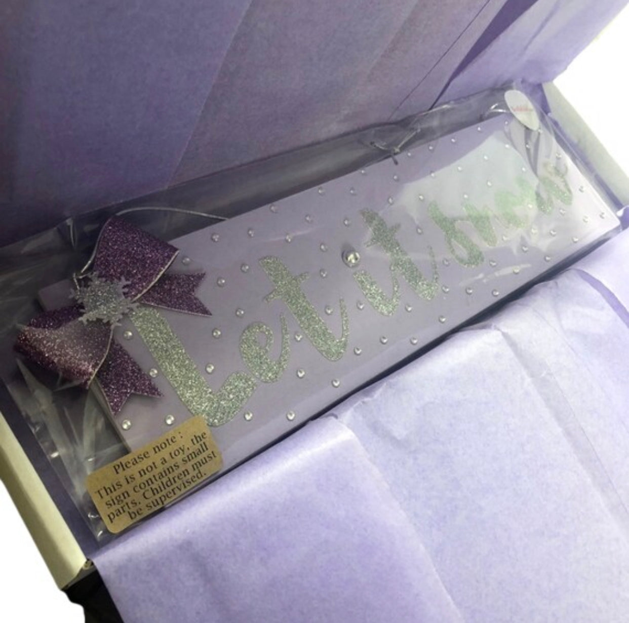 made from wooden mdf and measuring approximately 10.5" long x 3" wide, with a choice of colours, icy blue or purple, this stunning sparkly Christmas sign has gorgeous silver glitter font with the words "Let it snow", surrounded by diamantes .