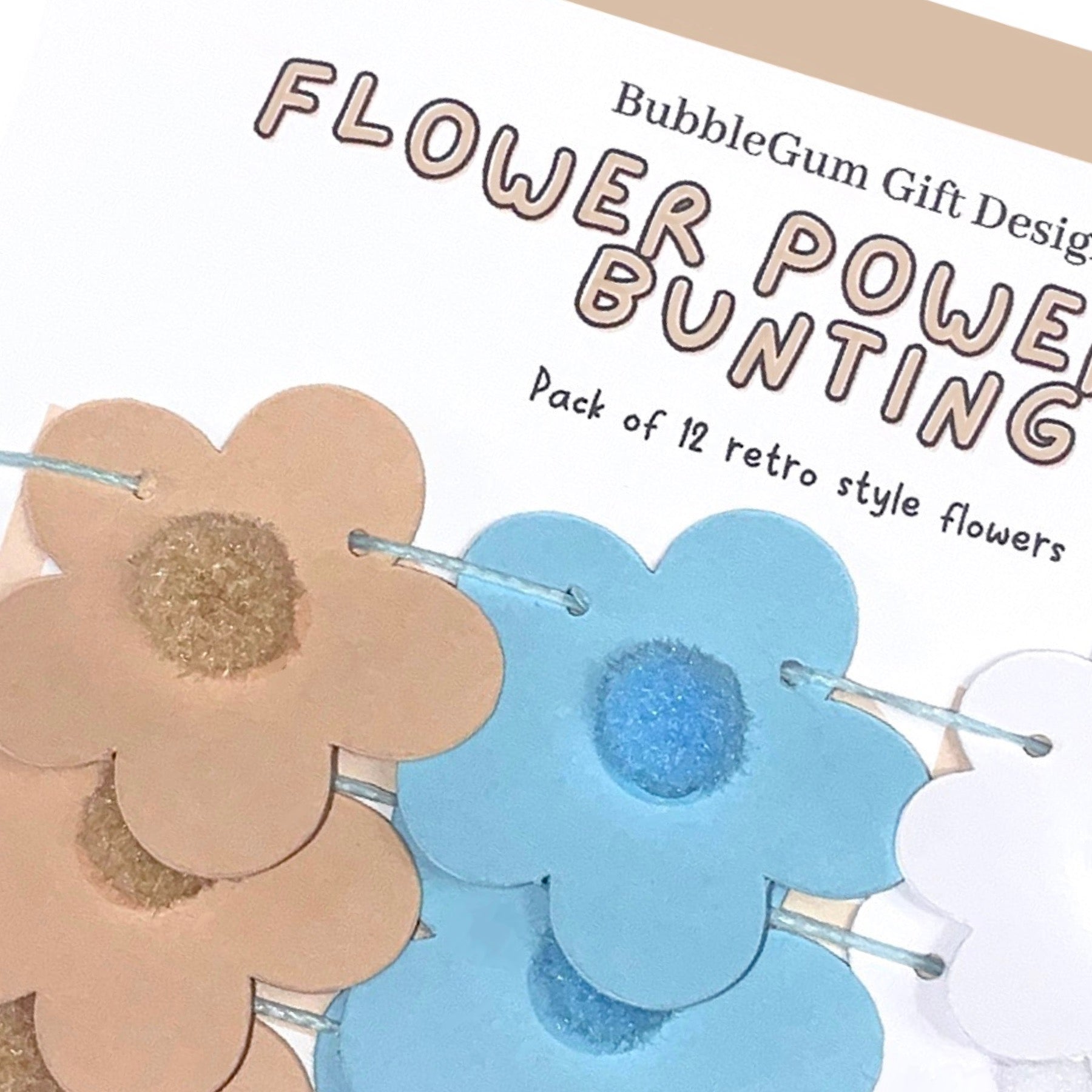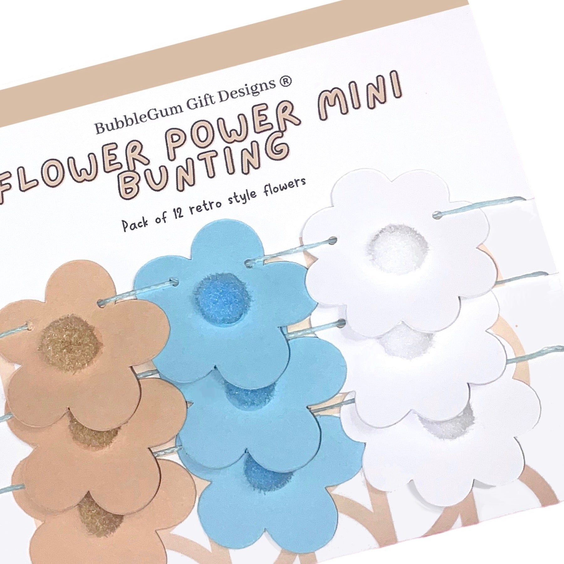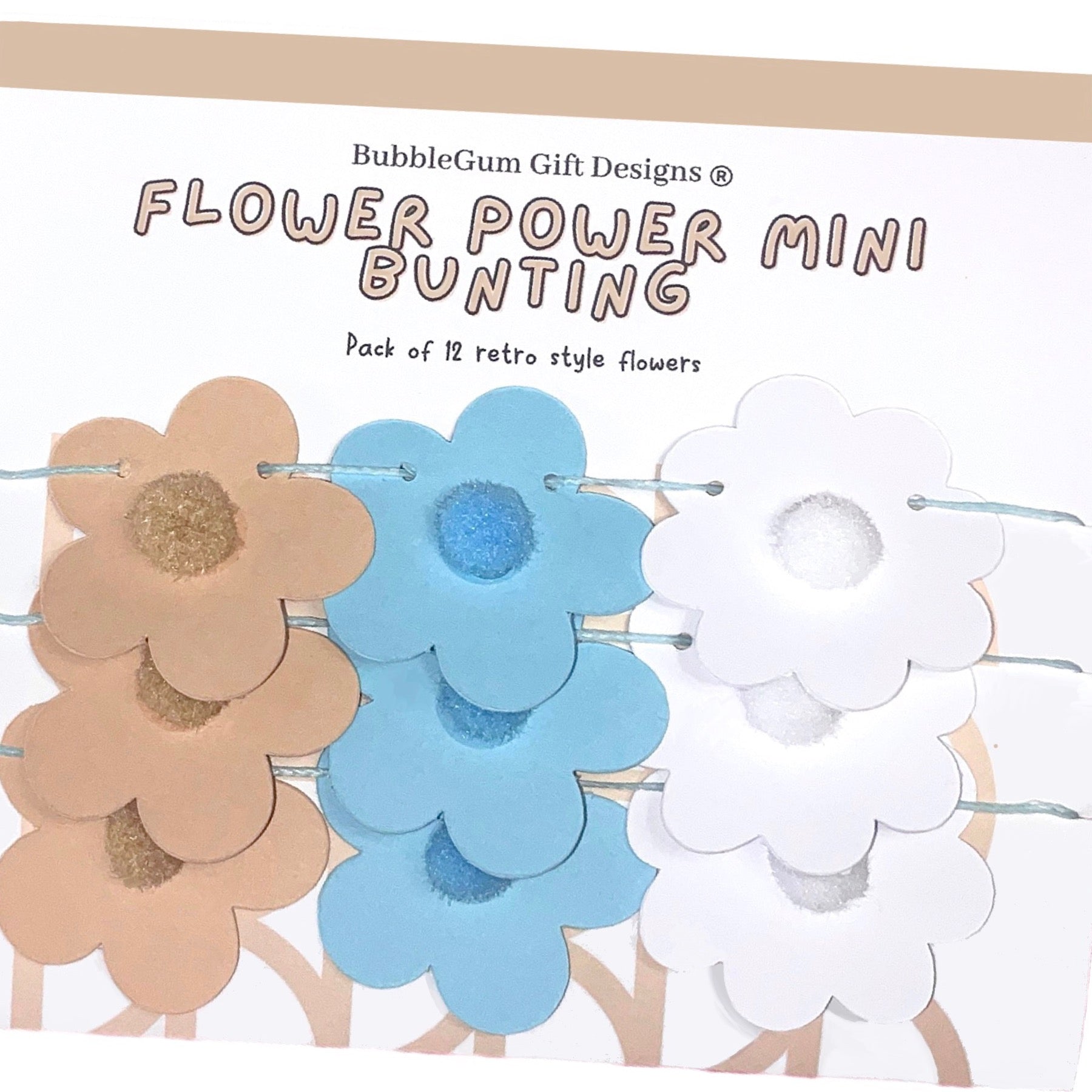 Groovy Pastel 70s Mini Flower Garland – Baby Blue & Beige Daisy Bunting with Fun Pom Pom Centres