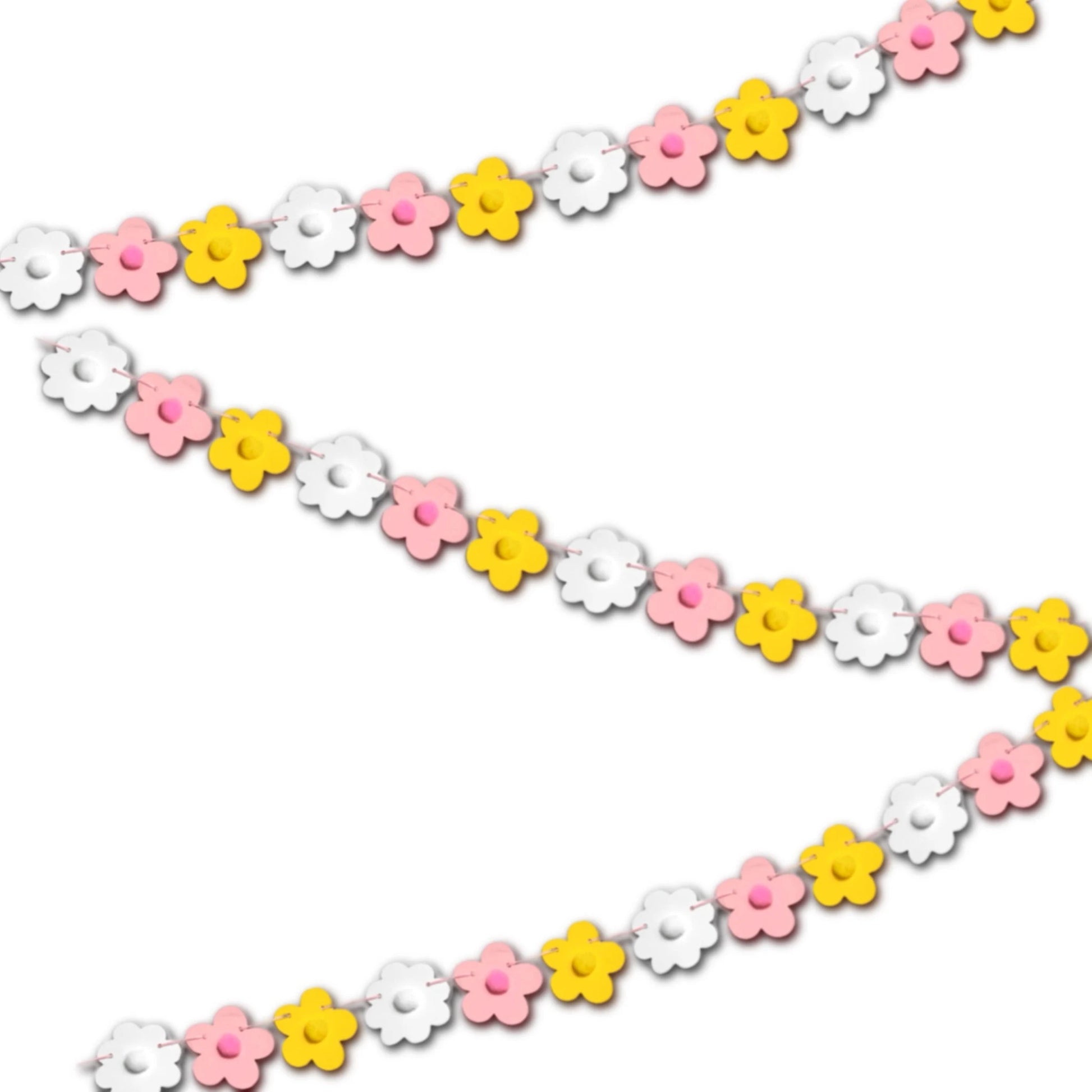 Mini Pink and Yellow Flower Power Mini Bunting Retro Groovy Flower Garland with Pom Pom Centres Cute 60s Flower hanging decoration Pre threaded Sleepover Party bag fillers for girls