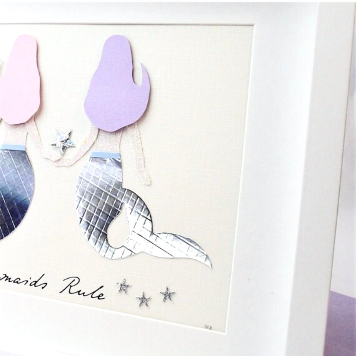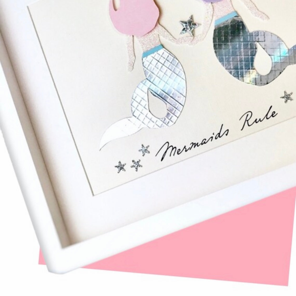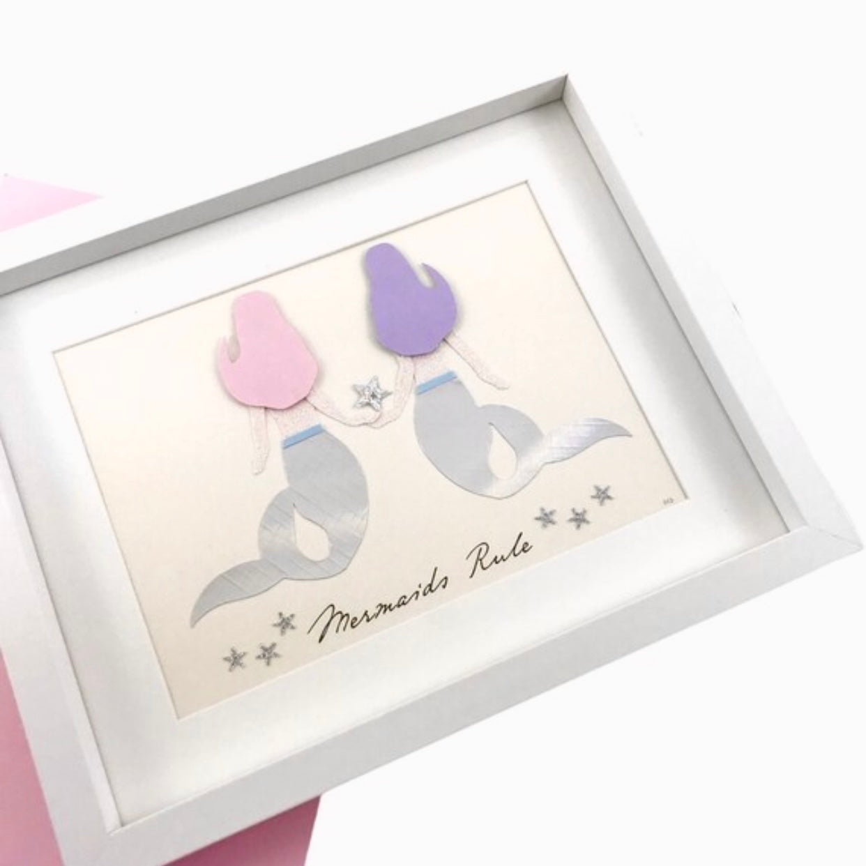 All drawn by hand first, then cut, and composed in 3d style. Two beautiful mermaids, each with their unique shaped hair, one pastel pink, one lavender, pink sparkly skin, with tiny waists and an elegant iridescent tail.