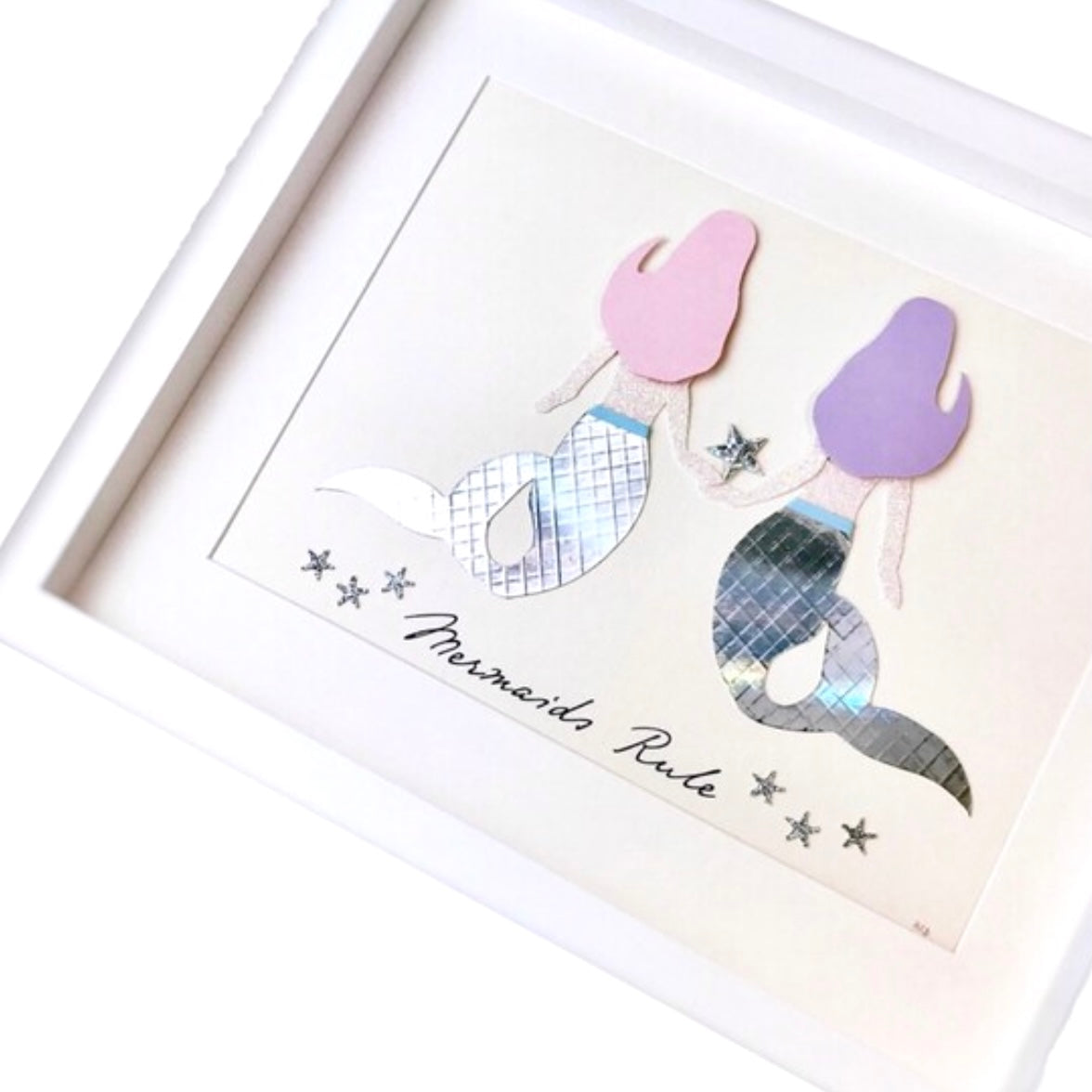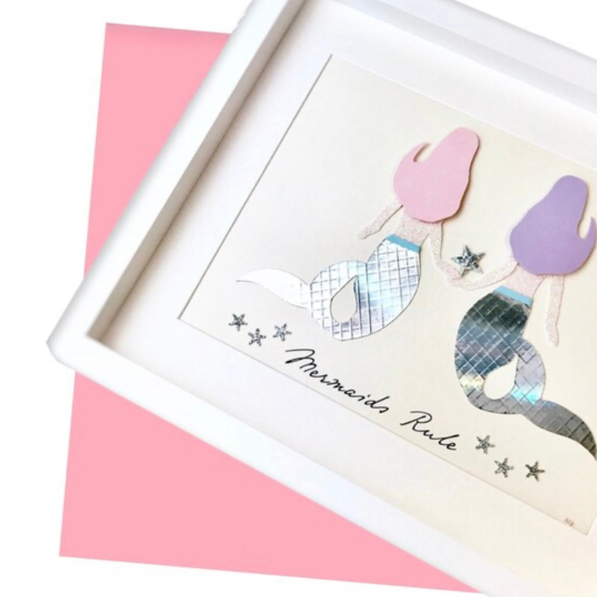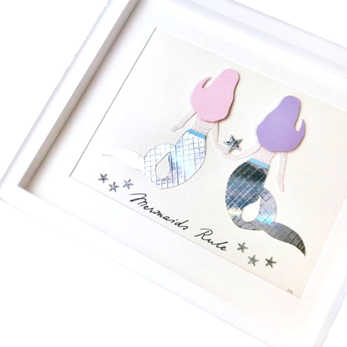 All drawn by hand first, then cut, and composed in 3d style. Two beautiful mermaids, each with their unique shaped hair, one pastel pink, one lavender, pink sparkly skin, with tiny waists and an elegant iridescent tail.