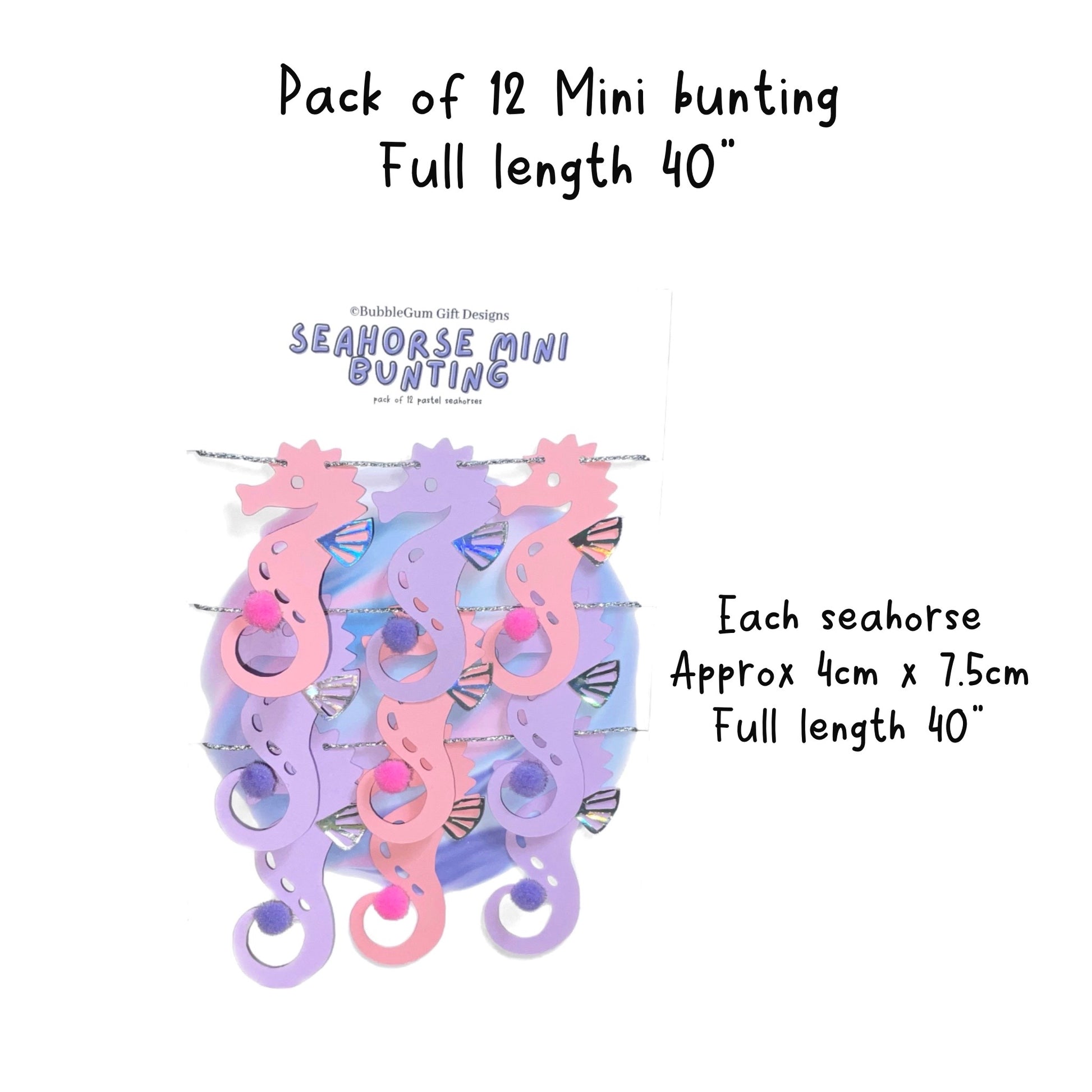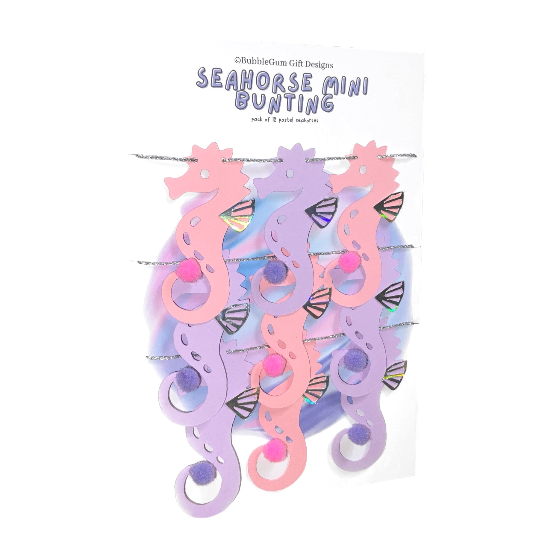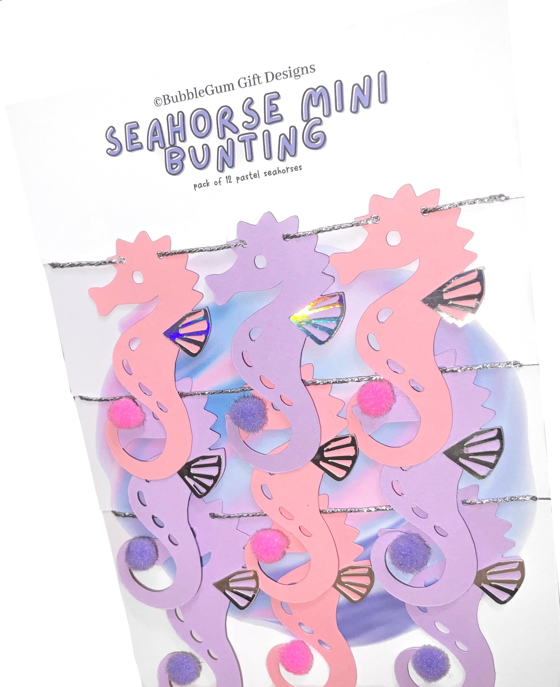 Attached to sparkly silver twine measuring approximately 40” these pastel pink and purple seahorses are made from premium card measuring approximately 4cm x 7.5cm with a fluffy Pom Pom at the end of their curly tail and an iridescent dorsal fin that catches all the colours of the rainbow - they are so pretty.