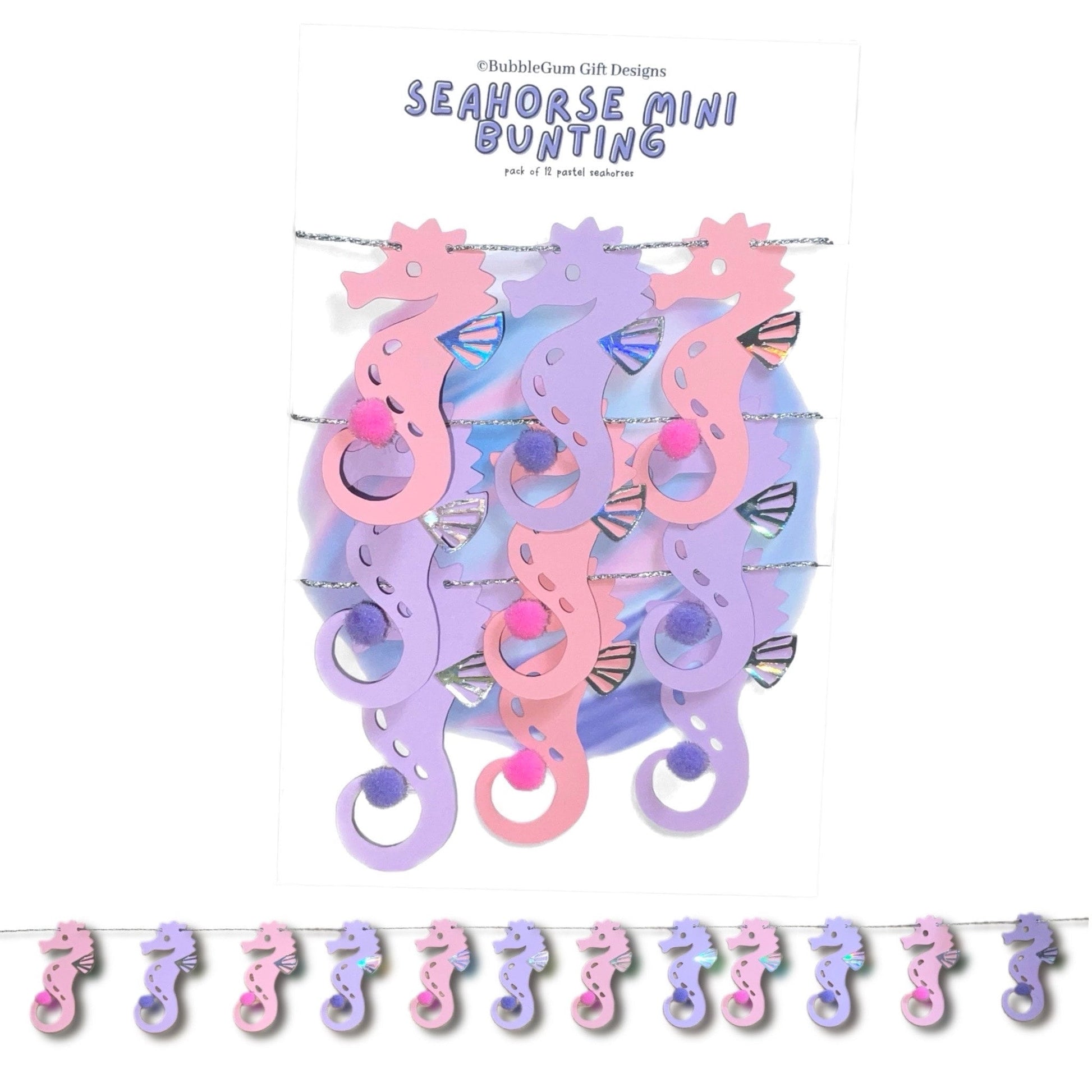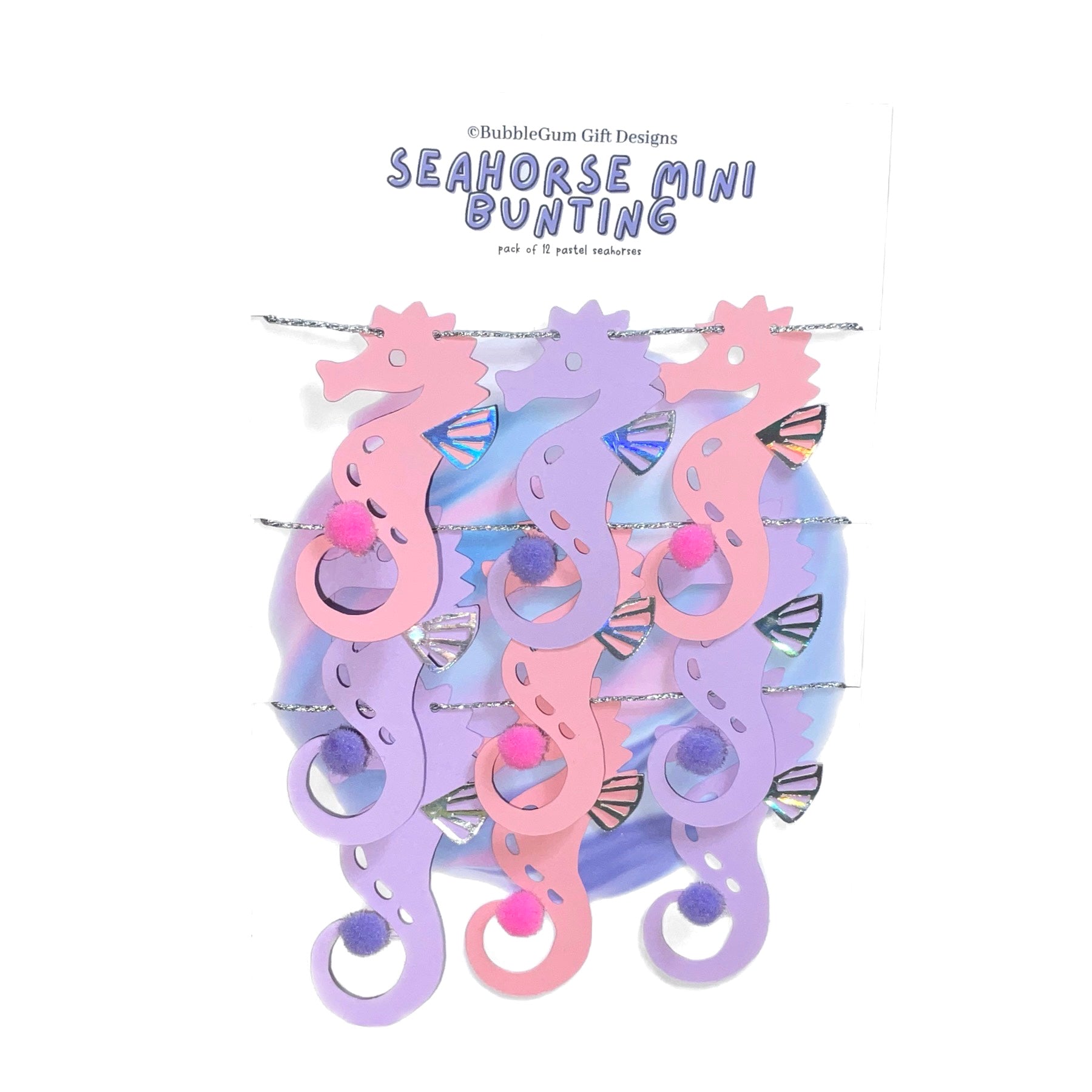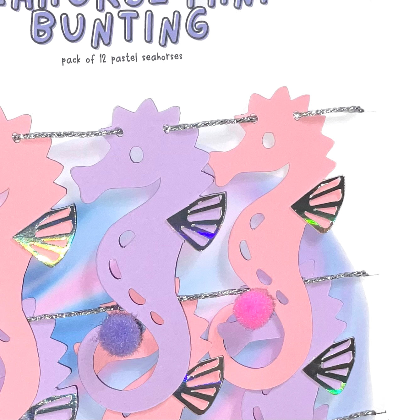 Attached to sparkly silver twine measuring approximately 40” these pastel pink and purple seahorses are made from premium card measuring approximately 4cm x 7.5cm with a fluffy Pom Pom at the end of their curly tail and an iridescent dorsal fin that catches all the colours of the rainbow - they are so pretty.