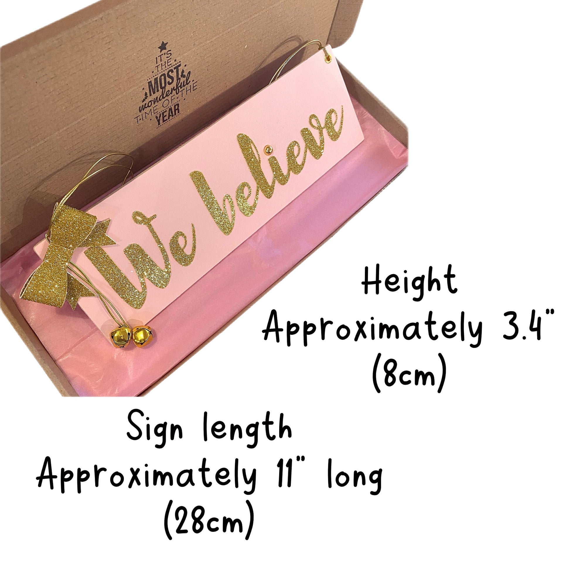 Each sign is approx 11” long x just over 3"wide with the glitter wording, "We believe"