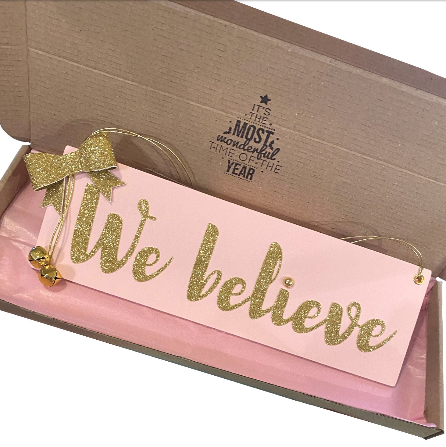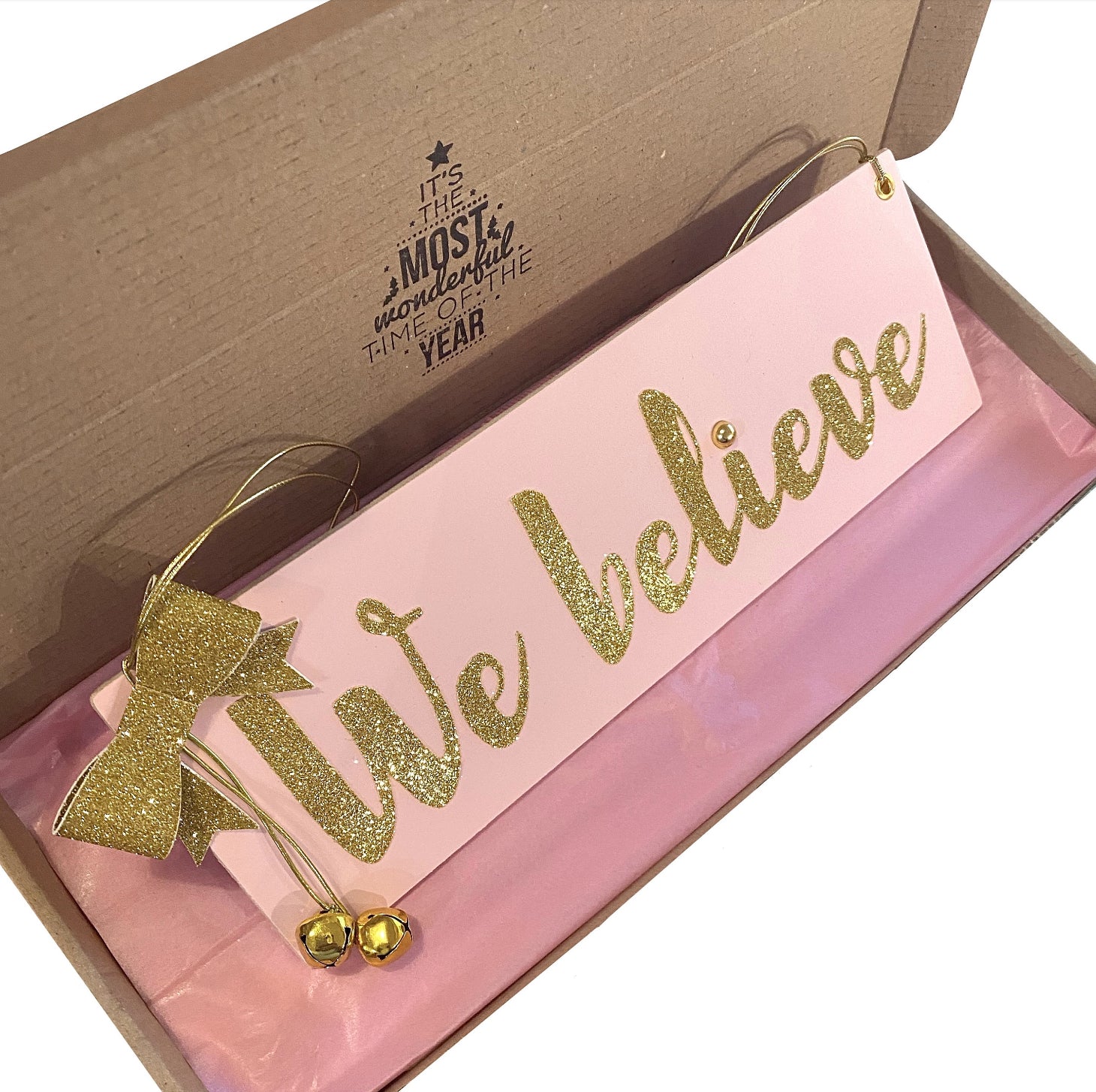 A lovely way to start the beginning of December, this sparkly pink and gold Christmas Sign, made by hand, is made from strong wooden mdf, With a beautiful gold glitter bow on the side and two gold bells to 'jingle' to say you believe.